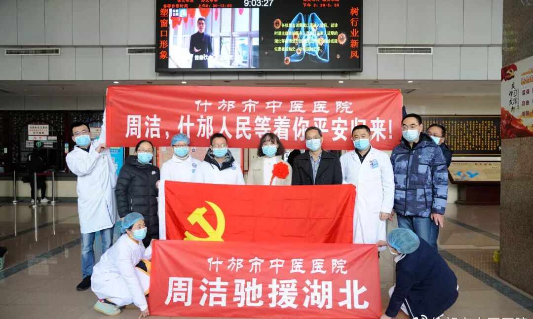 2月9日早上,什邡市中医医院门诊大厅,一场特殊的送行仪式正在这里举行。医院领导班子和科室代表参加了仪式,许多医院职工纷纷自发来到现场,为什邡市第一批援鄂医疗队员——医院ICU护士周洁加油。