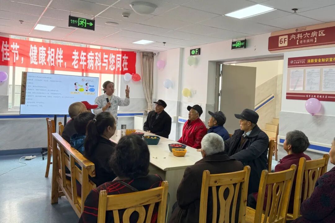 医院老年病科还为老年患者们开展了一场重阳节茶话会。以“听得懂、用得上”为核心,从秋冬季节高发的呼吸道疾病预防要点,到日常饮食、作息中隐藏的护理细节,医护人员结合真实案例娓娓道来,让老人们轻松掌握实用的健康技巧。