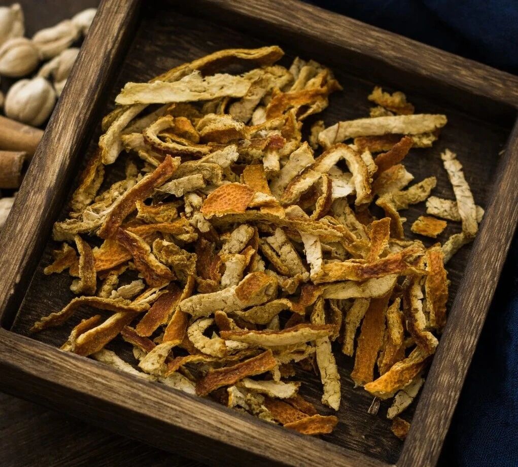 陈皮就是晒干的橘子皮,味辛微苦,能理气健脾、燥湿化痰。脾胃功能好了,吃进去的营养能消化,痰湿就不容易堆积。现代研究发现,陈皮里的橙皮苷和挥发油能抗氧化,防止血管硬化,改善血管内皮功能,还能增加脑血流量,给大脑“供氧”。