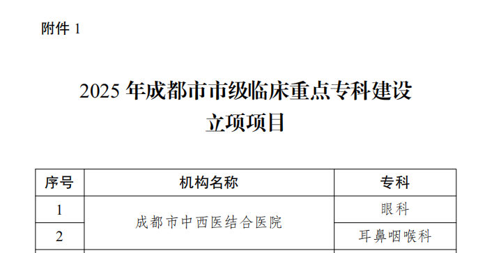 在临床专科建设领域,医院学科实力持续攀升。眼科、耳鼻咽喉头颈外科凭借扎实的学科基础,成功立项2025年成都市市级临床重点专科建设项目,标志着医院学科发展迈入新阶段,为打造高水平特色专科、提升核心竞争力奠定坚实基础。两大专科聚焦精准诊断、疑难病症攻坚、微创技术革新,构建起特色鲜明的发展体系,以优质医疗服务赢得患者广泛信赖。