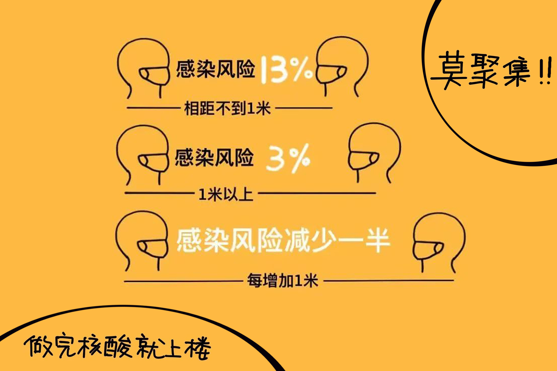 为了避免在核酸采样过程中发生交叉感染,请大家检测时做好个人防护,全程佩戴口罩,与他人保持1米以上间隔,不交谈,不聚集,做完核酸就回家,莫在小区打堆堆!