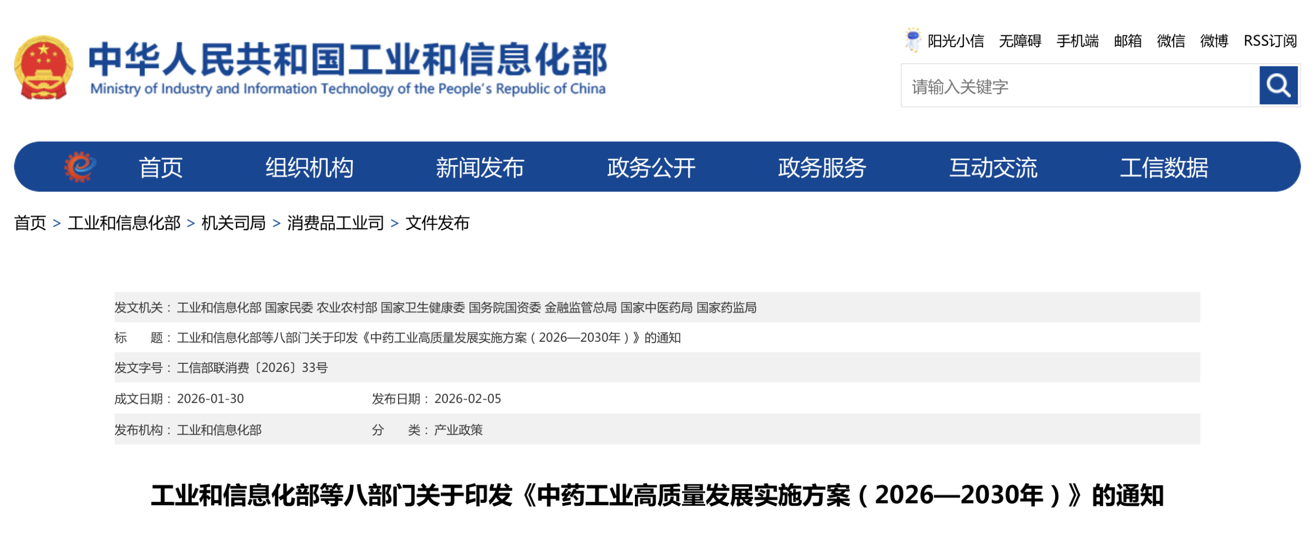 2月5日,工业和信息化部、国家民委、农业农村部、国家卫生健康委、国务院国资委、金融监管总局、国家中医药局、国家药监局等八部门印发《中药工业高质量发展实施方案(2026—2030年)》。《实施方案》以稳定供应、协同创新、智能制造、产品推广、服务体系构建为抓手,统筹推进六个方面共15项任务,进一步推动中药工业全产业链协同和高质量发展。