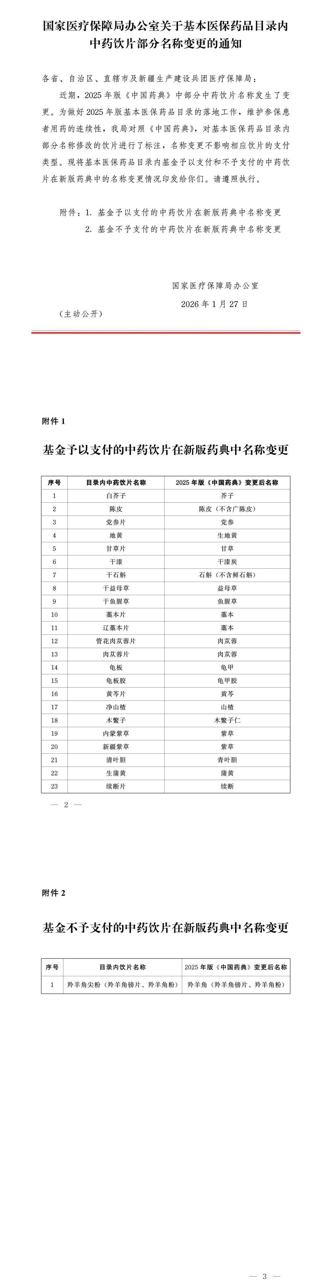 因2025年版《中国药典》中部分中药饮片名称发生了变更,日前,国家医疗保障局发布《关于基本医保药品目录类中药饮片部分名称变更的通知》,对照《中国药典》,对基本医保药品目录内部分名称修改的饮片进行了标注。其中,“白芥子”变更为“芥子”,“陈皮”变更为“陈皮(不含广陈皮)”,“党参片”变更为“党参”,“地黄”变更为“生地黄”,“甘草片”变更为“甘草”等。