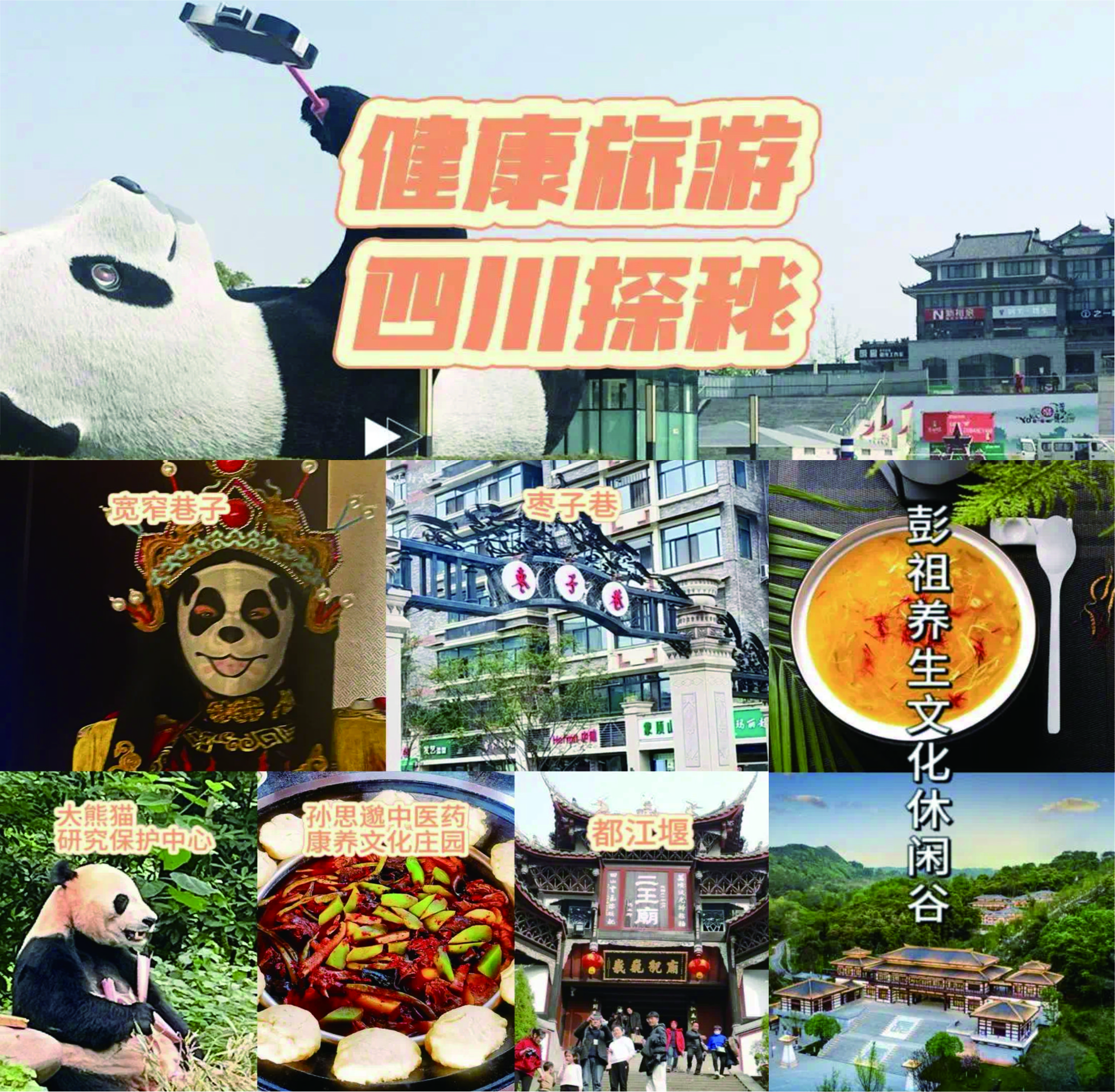 宽窄巷子-枣子巷-大熊猫保护研究中心-孙思邈中医药康养文化庄园-都江堰景区-九寨沟康养度假区-雅安-彭祖养生文化休闲谷-攀西